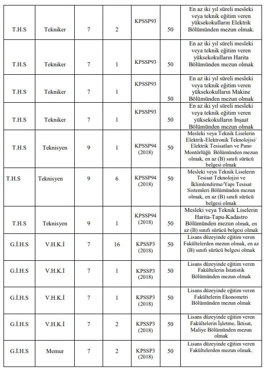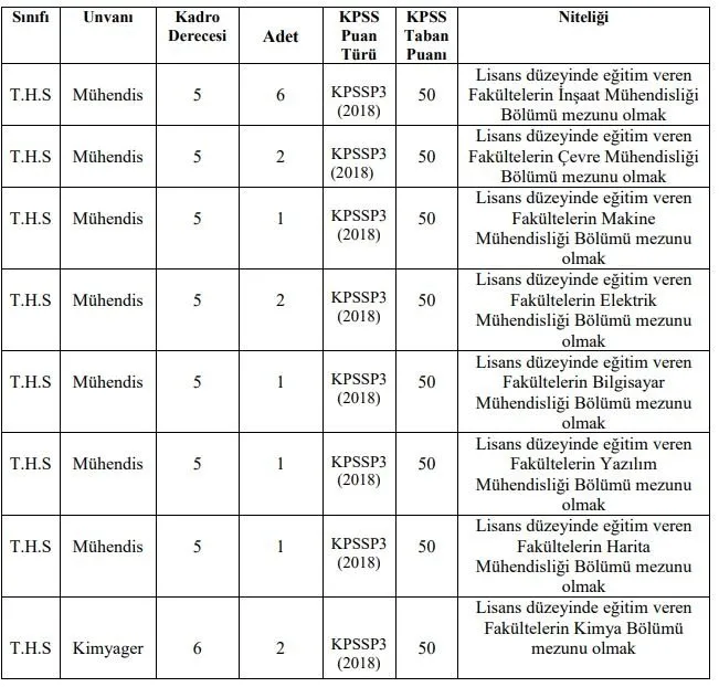 Mahalli İdarelere İlk Defa Atanacaklara Dair Sınav ve Atama Yönetmeliği hükümleri çerçevesinde; Genel Müdürlüğümüzün 657 Sayılı Devlet Memurları Kanununa tabi münhal bulunan aşağıda sınıfı, unvanı, derecesi, adedi, KPSS puan türü, KPSS taban puanı ve nitelikleri belirtilen 51 adet Memur kadrosuna, Kamu Personeli Seçme Sınavına (KPSS) girmiş ve Genel Müdürlüğümüz sınav komisyonunca belirlenen aşağıdaki taban puanlarına göre Genel Müdürlüğümüze müracaat eden adaylar arasından, en yüksek puandan başlamak üzere kadro ve öğrenim durumları itibariyle ilan edilen sayıların 5 katı aday belirlenerek sözlü sınava çağırılacaktır.