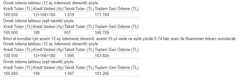 Bu kapsamda birinci el/sıfır konutlar için azami 12 ay ödemesiz dönemli, 15 yıla kadar vade ve aylık yüzde 0,64 faiz oranı ile finansman imkanı sunulacak.
