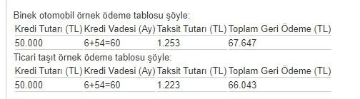 İkinci el binek araç (motosiklet dahil) veya ticari araç satın alacak bireysel/kurumsal müşterilere yüzde 0,82 faiz oranı ile taşıt kredisi imkanı sağlanacak. Azami 6 ay ödemesiz toplam azami 60 ay vadeli 2. el binek otomobil ve ticari taşıt kredilerinde azami limit 150 bin TL olacak. Kredi tutarı kasko değeri üzerinden öz kaynak/yabancı kaynak üzerinden hesaplanacak olup 7 yaşa kadar olan taşıtlar kredilendirilecek.
